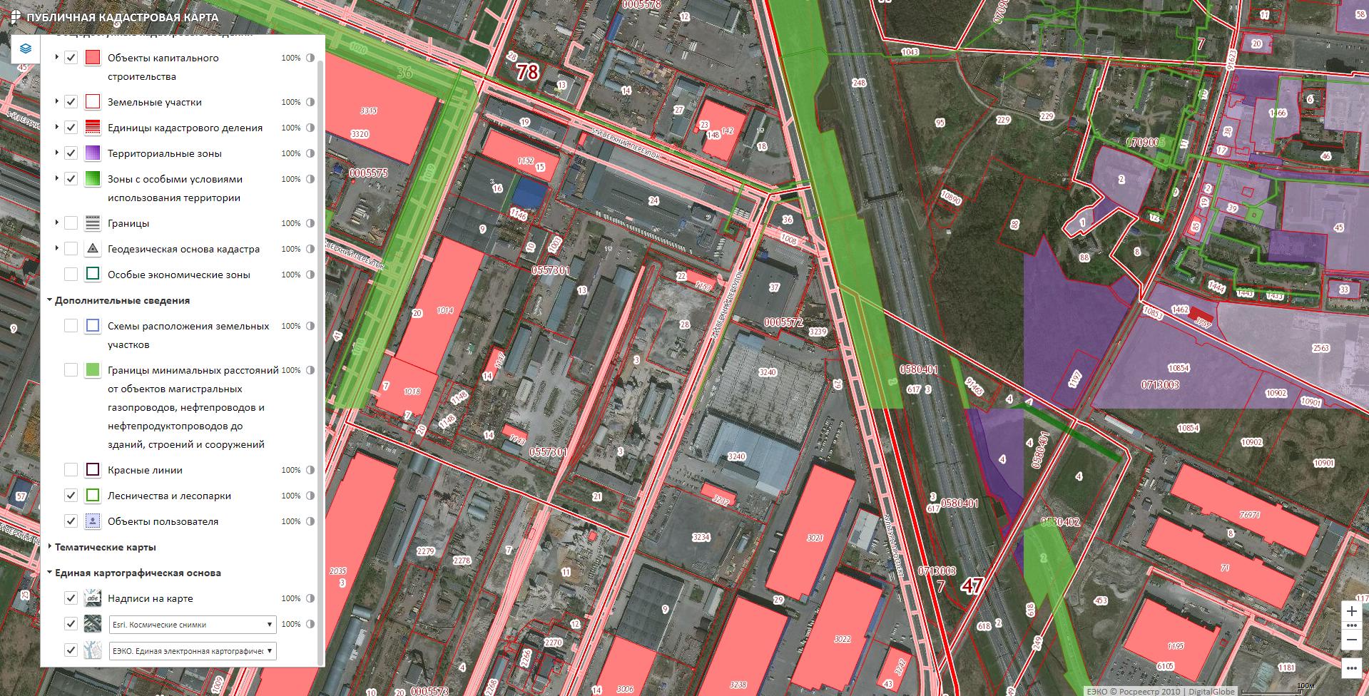 Например, так выглядит рабочее окно ПКК при включении всех слоев единой картографической основы, дополнительных сведений и общедоступных сведений ПКК: